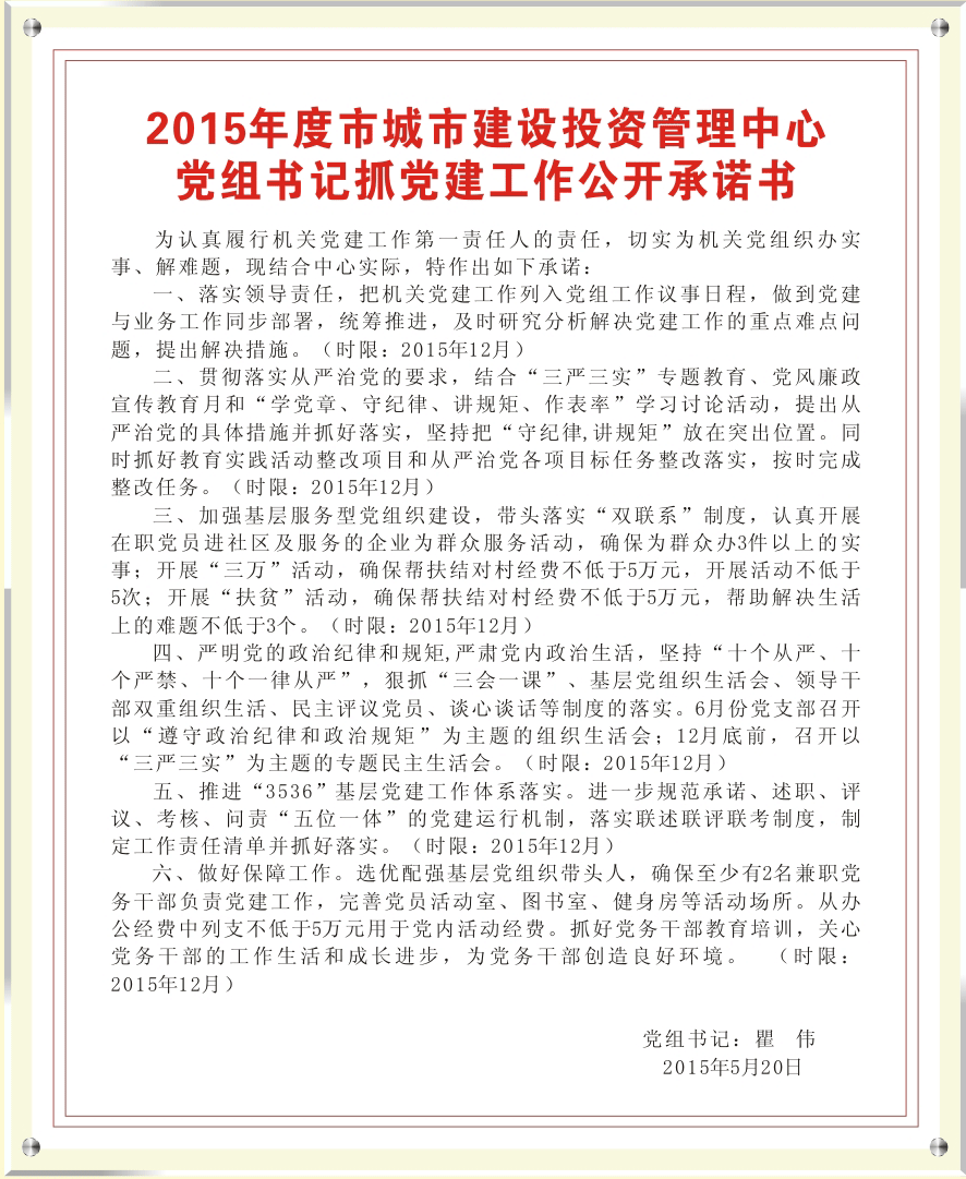 2015年度市城市建設(shè)投資管理中心黨組書記抓黨建工作公開承諾書
