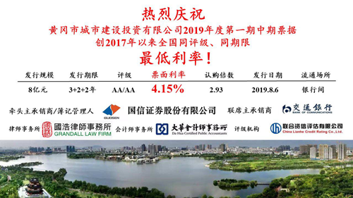 我公司作為本期中期票據(jù)的發(fā)行人,在主承銷商、聯(lián)席主承銷商及相關(guān)評級、法務(wù)機構(gòu)、會計師事務(wù)所的大力支持下,科學(xué)謀劃發(fā)行各項工作,精心組織募集說明書、主體評級、債項評級及審計報告、法律意見書等資料,積極加強與投資人溝通,深入宣傳黃岡城投業(yè)績,充分展示黃岡城投形象,得到了廣大投資人的高度認(rèn)可,確保了本期發(fā)行工作圓滿順利。本期中票成功發(fā)行,優(yōu)化了公司債務(wù)結(jié)構(gòu),為公司今后持續(xù)健康發(fā)展、助推黃岡市區(qū)經(jīng)濟高質(zhì)量發(fā)展提供了有力支撐。