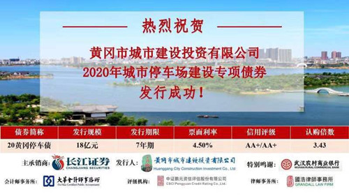 三年磨一劍,礪得梅花香。面對(duì)近期投資市場利率持續(xù)上漲的不利局面,公司在市政府及相關(guān)部門大力支持下,克服重重困難,會(huì)同主承銷商多渠道、多路徑聯(lián)絡(luò)機(jī)構(gòu)投資者,廣泛募集資金,于8月13日成功發(fā)行了2020年城市停車場建設(shè)專項(xiàng)債券(簡稱“20黃岡停車債”)。本期債券發(fā)行規(guī)模18億元,發(fā)行期限7年,主體和債項(xiàng)評(píng)級(jí)均為AA+。在本地銀行武漢農(nóng)商行、光大銀行、漢口銀行等銀行機(jī)構(gòu)的積極認(rèn)投下,全場認(rèn)購倍數(shù)達(dá)到3.43倍,票面利率4.5%。