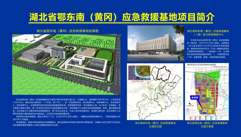 基地立足黃岡,輻射鄂州、黃石、咸寧,按照省市共建共管原則,建設(shè)工期為27個月,2020年10月開工建設(shè),一期建設(shè)應(yīng)急物資儲備中心,二期后續(xù)建設(shè)計劃2022年12 月建成。